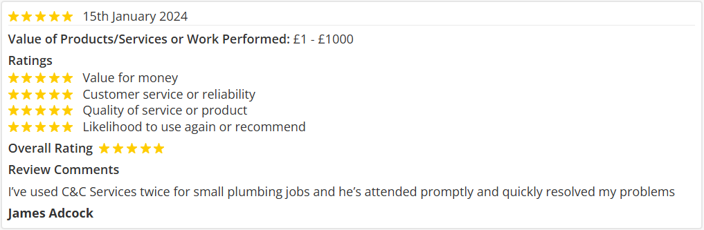 We found C & C Services on the norfolk trusted trader website when we need a plumber for a previous job. Excellent service then, so obvious 1st choice for the current job. Happy to recommend C & C Services as trustworthy and reliable.