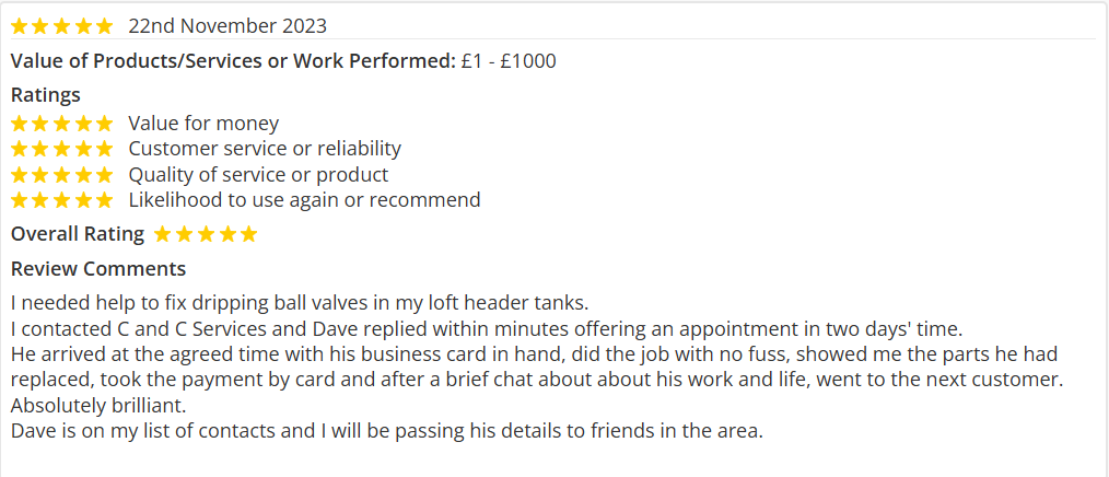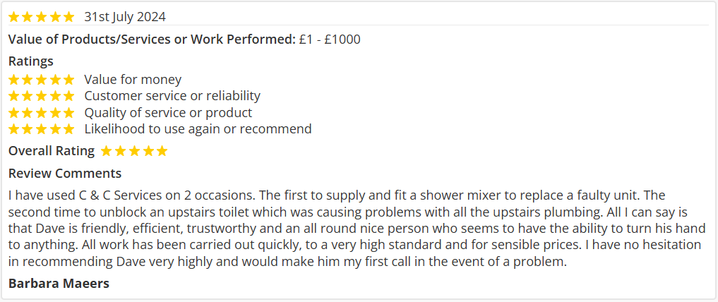 We found C & C Services on the norfolk trusted trader website when we need a plumber for a previous job. Excellent service then, so obvious 1st choice for the current job. Happy to recommend C & C Services as trustworthy and reliable.
